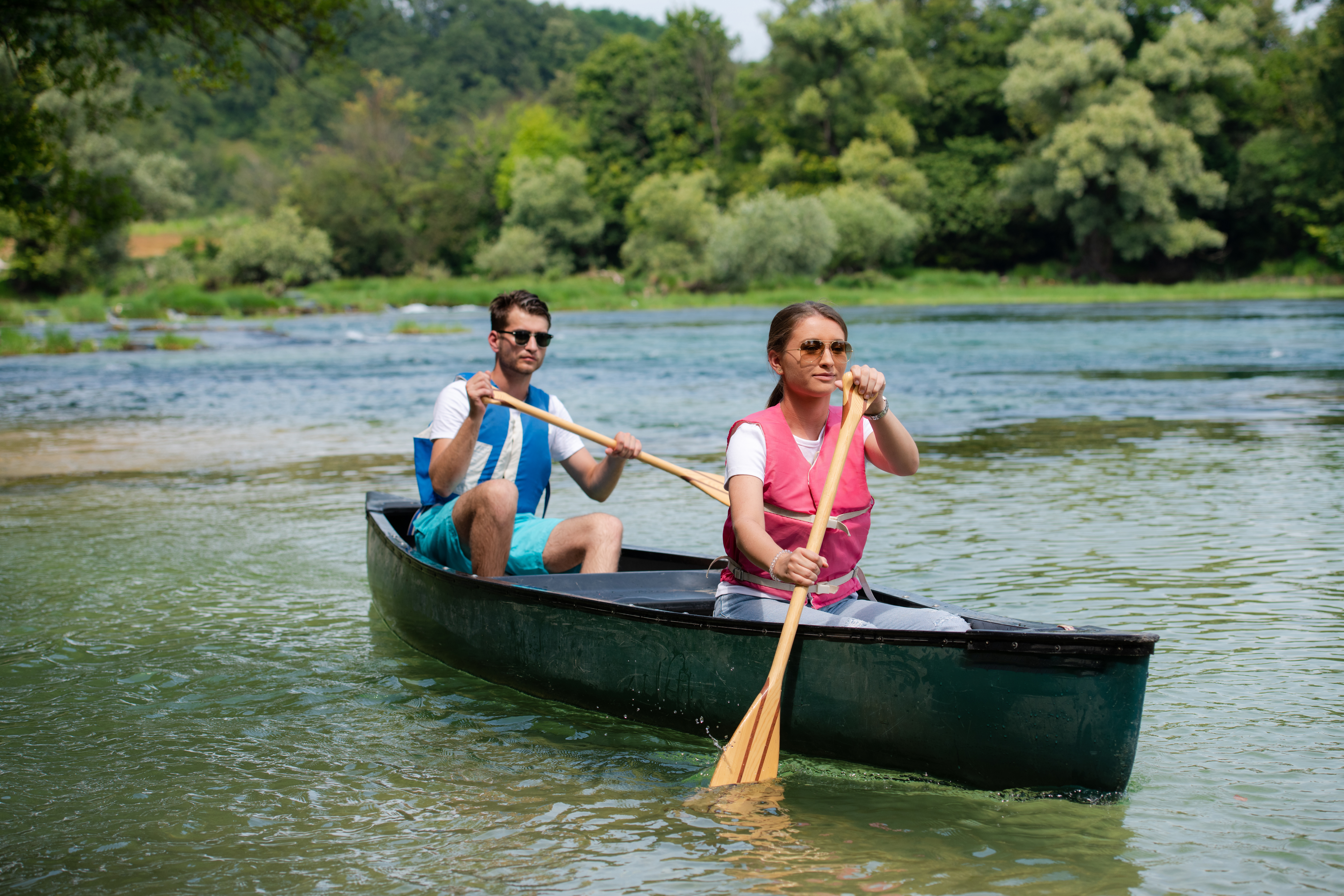 To go forward in the kayak you use the forward stroke technique. This stroke is done in 4 steps. At the first step you put the paddle in the water as close to the boat as possible. Try to avoid splashing. Your trunk and arms may move slightly forward. At step 2, pull the paddle backwards with your lower arm. With your upper arm, you actively push the other side of the paddle forward. In this way, you create a leverage effect. This leverage effect is important in order to save strength. In step 3, you lift the paddle blade with the narrow side out of the water so that you scoop up as little water as possible. Finally, in step 4, bring the paddle back to the front. In doing so, you make sure that the paddle moves as close to the water as possible.