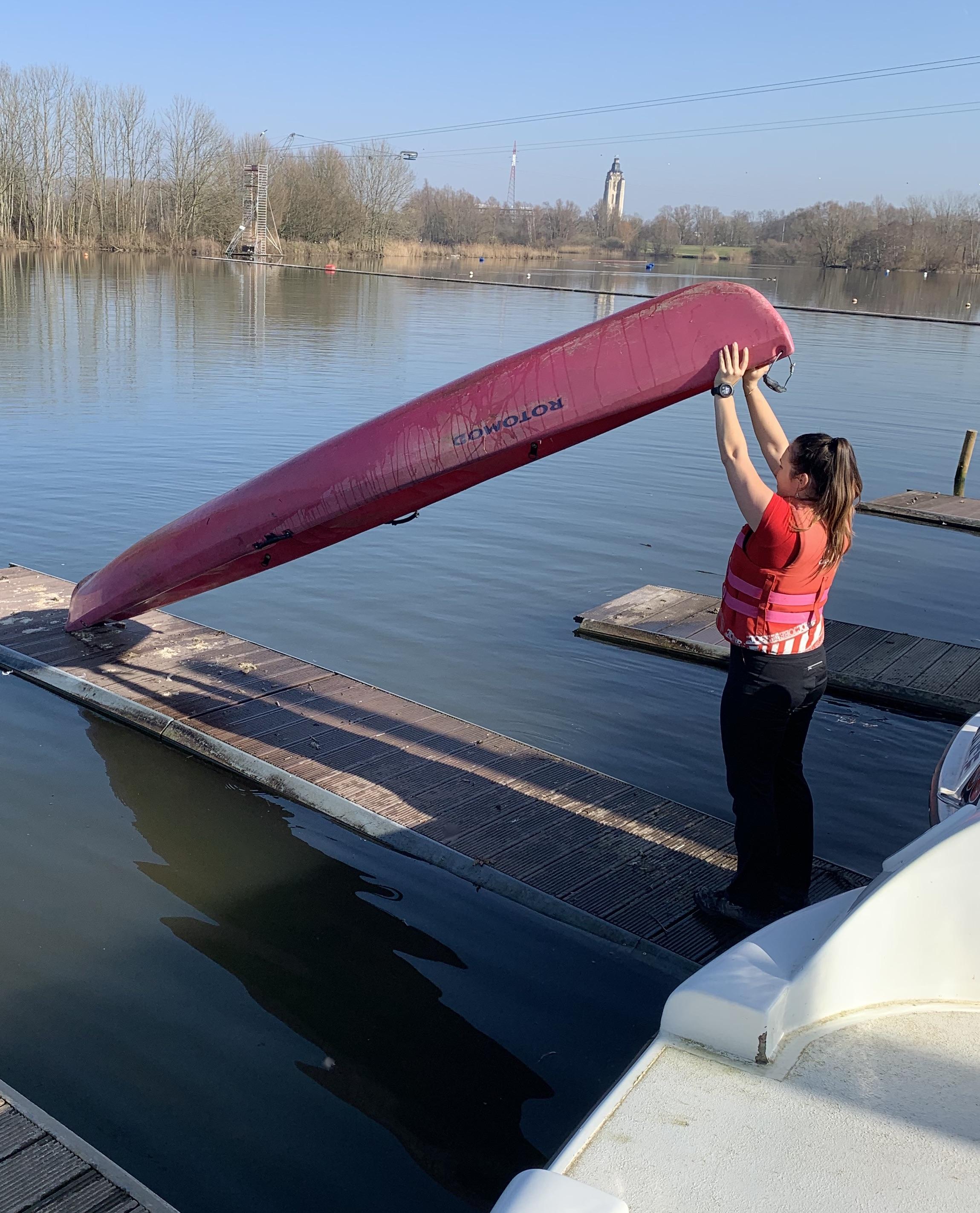 On the water it can happen that you fall over and your boat fills with water. In a kayak, you pull the boat to the side and tip it over as shown in the picture to let the water out. With the canoe this is a bit more difficult. When the canoe is filled with water, you cannot lift it easily. So it is best to pull your canoe with 2 on the side and lift it inch by inch so that the water can slowly flow out. A small bucket can also be a great help to free the canoe of water. Take plenty of time because it takes a while to get all the water out of the boat.