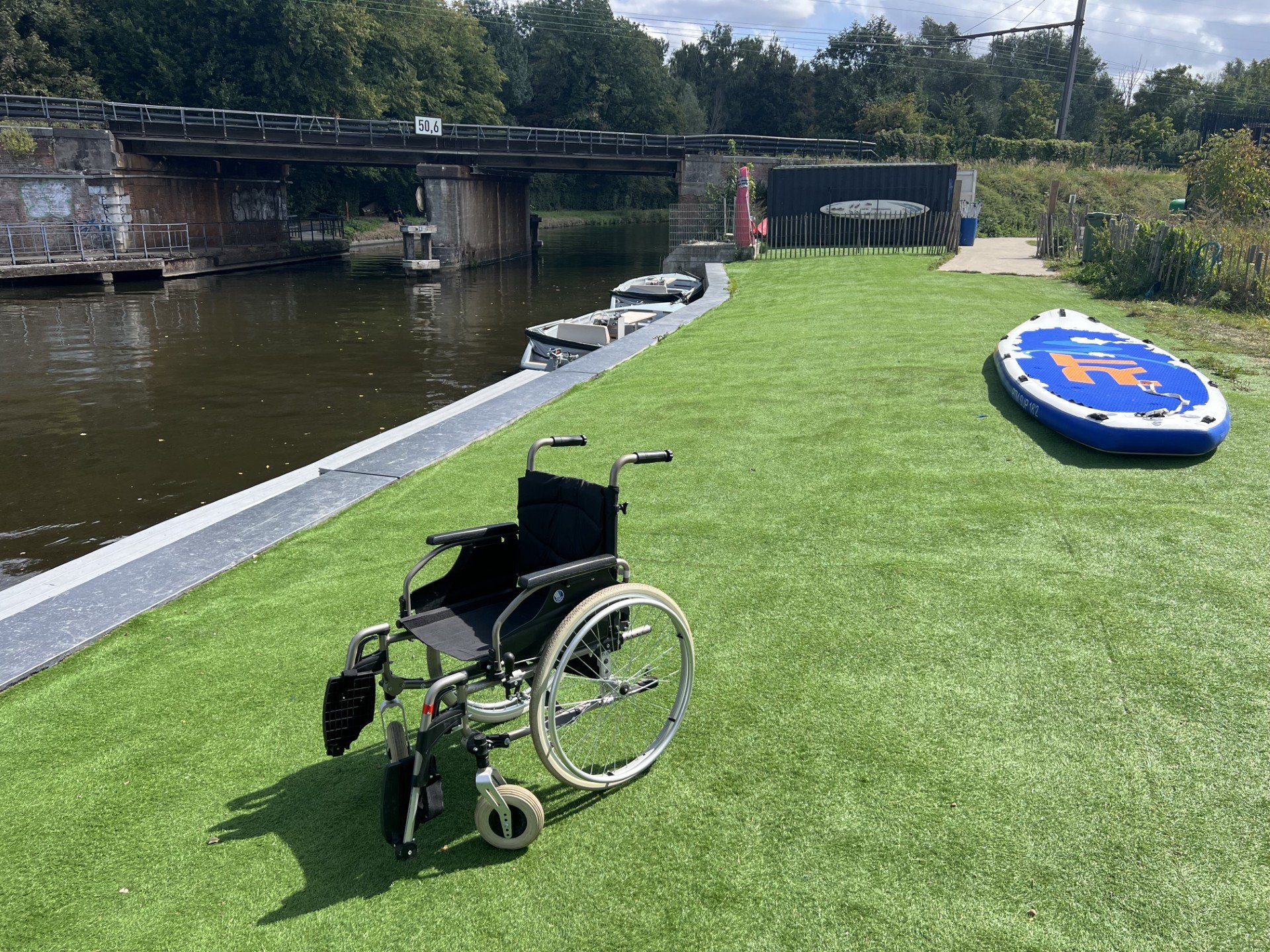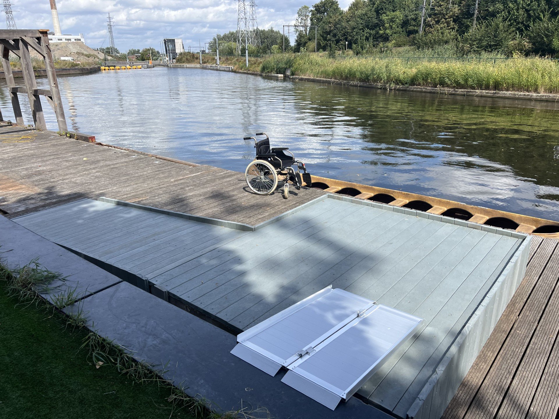 Those who wish to go canoeing, take a tour in an electric whisper boat or a giant canoe should proceed to the large pontoon. From the artificial grass, you can easily drive over the kerb onto the ramp, which takes you onto the pontoon. Once on the pontoon, you can easily turn and continue driving up a slight slope to the base level of the large pontoon. From here, you can easily be helped into the kayak, electric sloop or giant canoe.