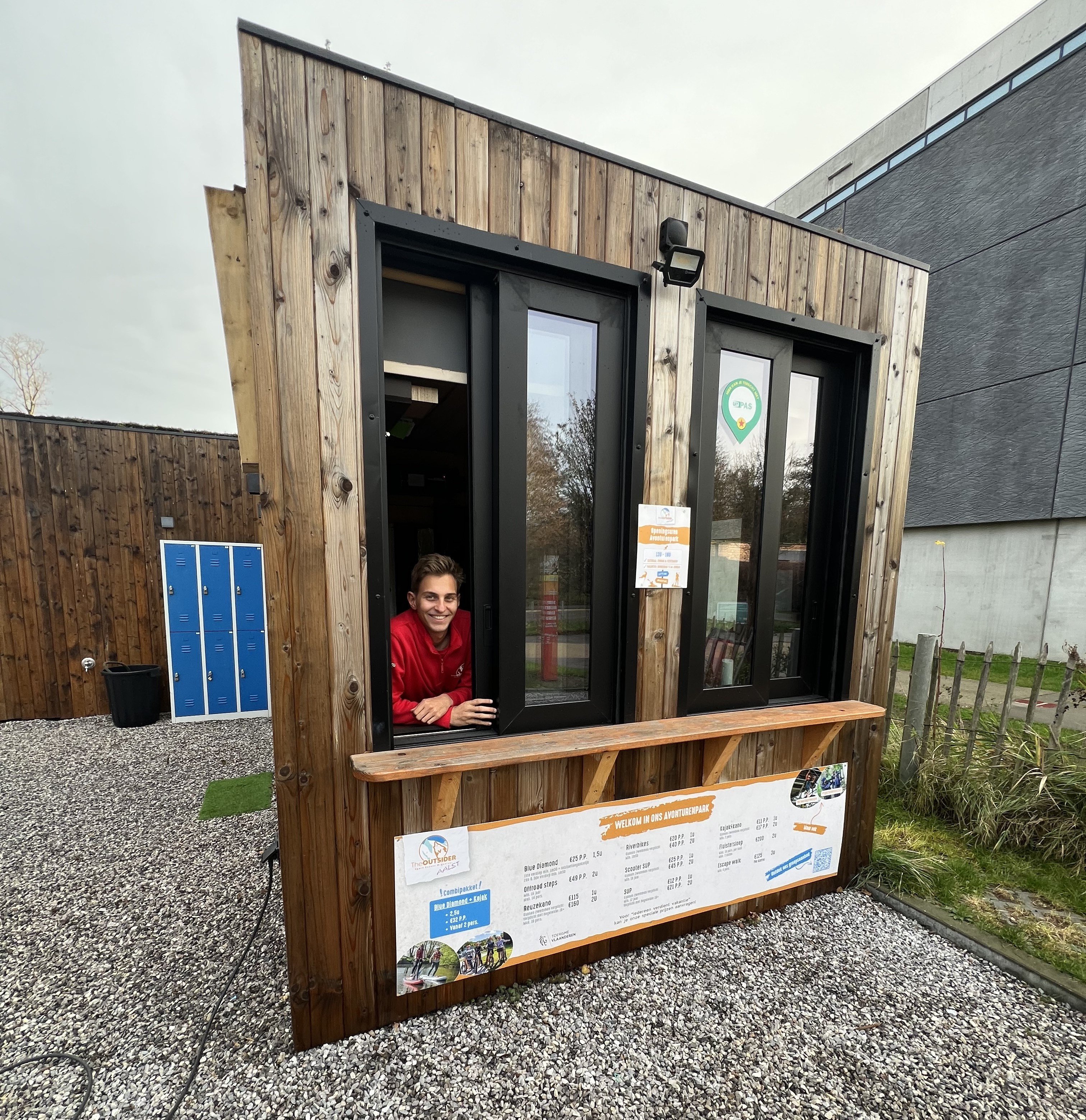 Here you will find tables and a counter that are easily accessible by wheelchair. Outside, there are also tables on the grass, under a large tent that provides shelter from the sun and rain. Lockers are located next to the entrance.